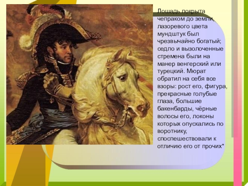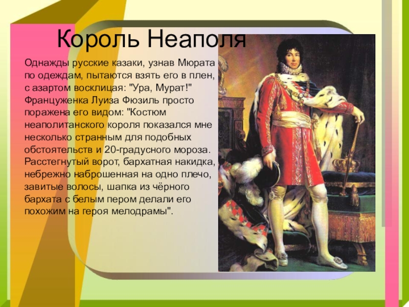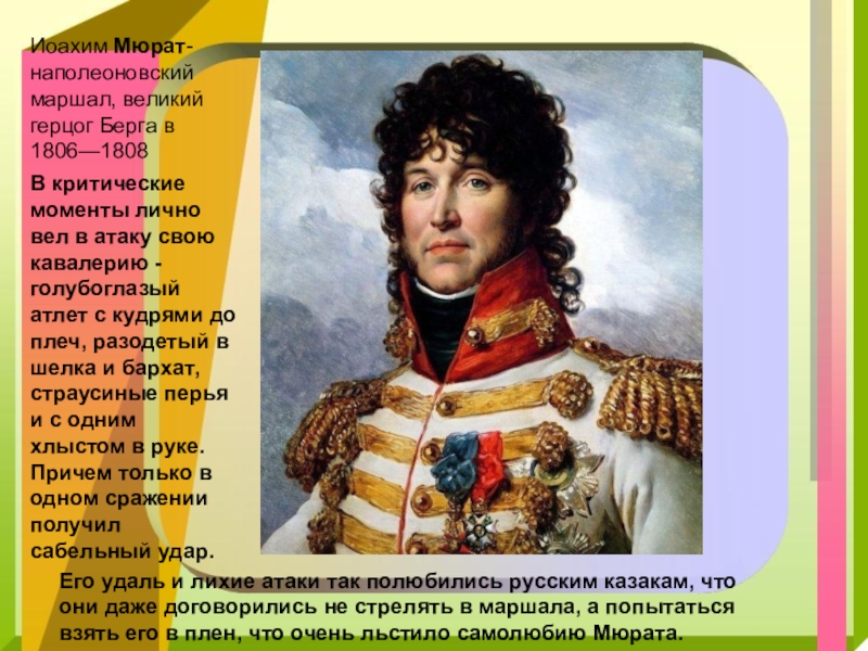 Его удаль и лихие атаки так полюбились русским казакам, что они даже договорились не стрелять в маршала, а попытаться взять его в плен, что очень льстило самолюбию Мюрата.