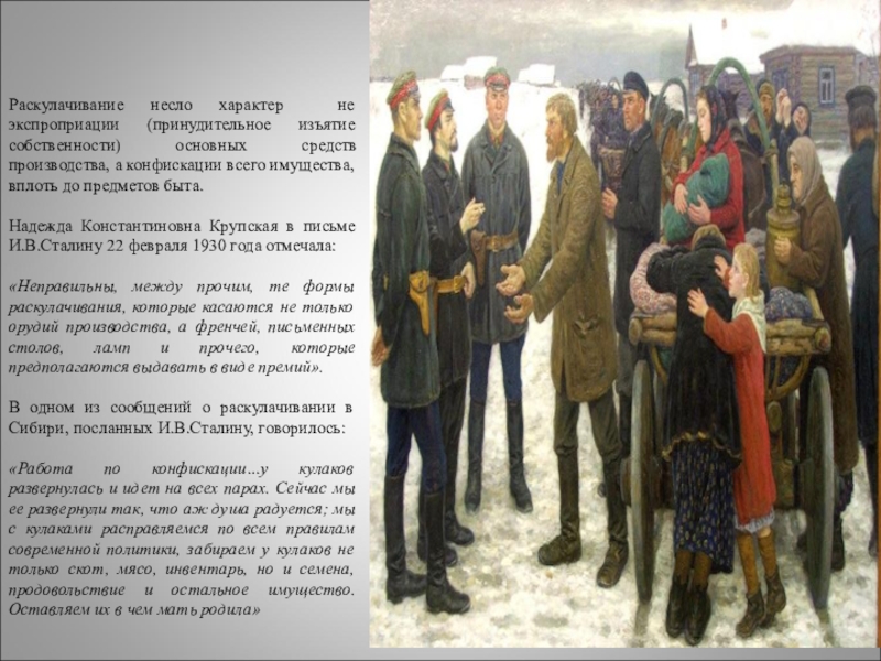 Слайд 7Раскулачивание несло характер не экспроприации (принудительное изъятие собственности) основных средств производства,