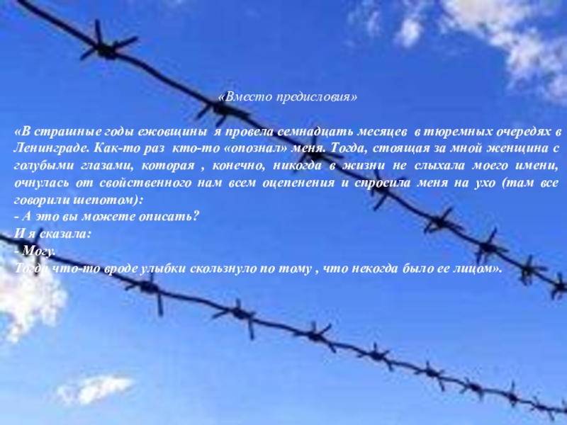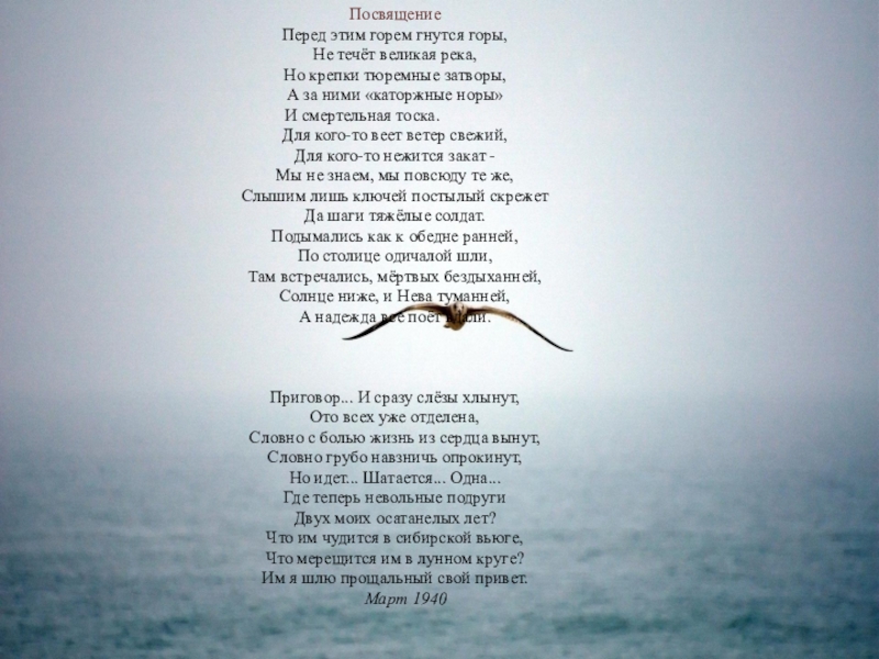 заявляет о том, что ее поэма – надгробное слово, посвященное всем погибшим в страшные времена сталинских репрессий, а также тем, кто страдал, переживая за своих репрессированных родных и близких, в коих от страданий умирала душа.