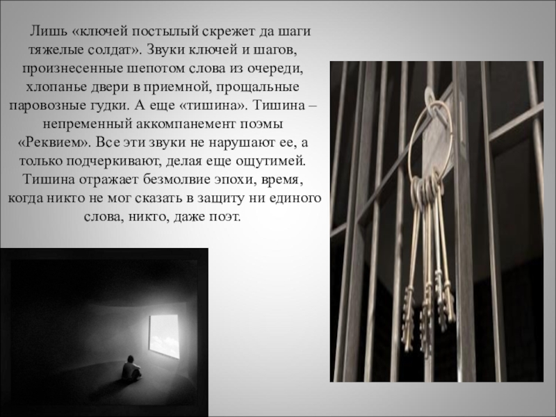 ключей и шагов, произнесенные шепотом слова из очереди, хлопанье двери в приемной, прощальные паровозные гудки. А еще «тишина». Тишина – непременный аккомпанемент поэмы «Реквием». Все эти звуки не нарушают ее, а только подчеркивают, делая еще ощутимей. Тишина отражает безмолвие эпохи, время, когда никто не мог сказать в защиту ни единого слова, никто, даже поэт.