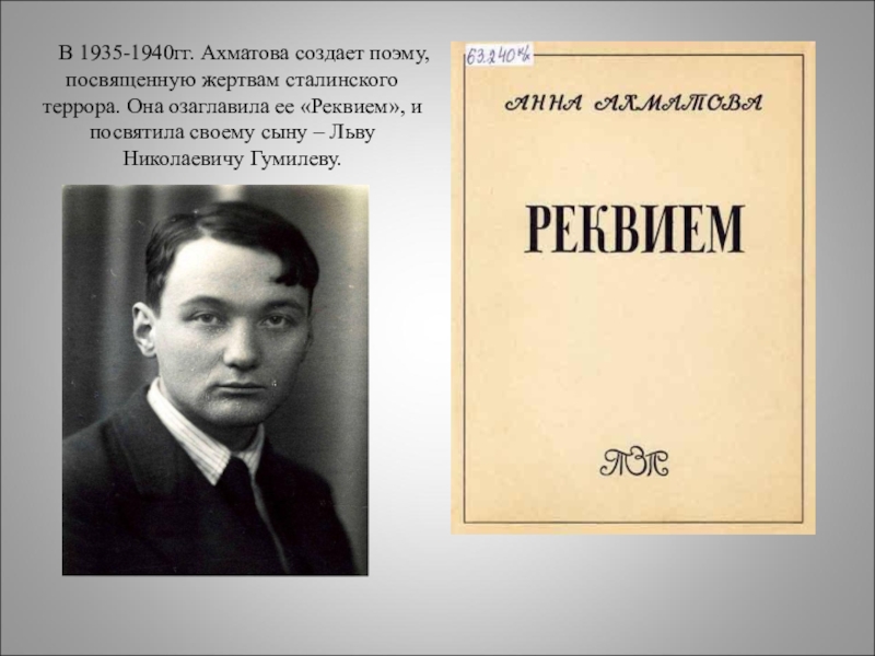 Слайд 13 В 1935-1940гг. Ахматова создает поэму, посвященную жертвам сталинского террора.