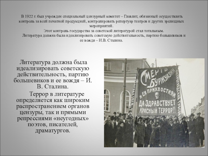 Литература должна была идеализировать советскую действительность, партию большевиков и ее вождя – И.В. Сталина.