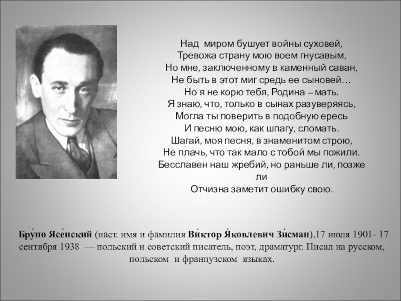 Слайд 2Бру́но Ясе́нский (наст. имя и фамилия Ви́ктор Я́ковлевич Зи́сман),17 июля 1901- 17 сентября
