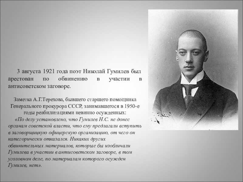 Слайд 10 3 августа 1921 года поэт Николай Гумилев был