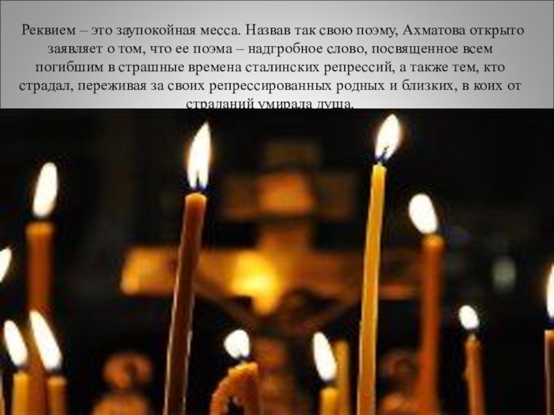 Слайд 14Реквием – это заупокойная месса. Назвав так свою поэму, Ахматова открыто
