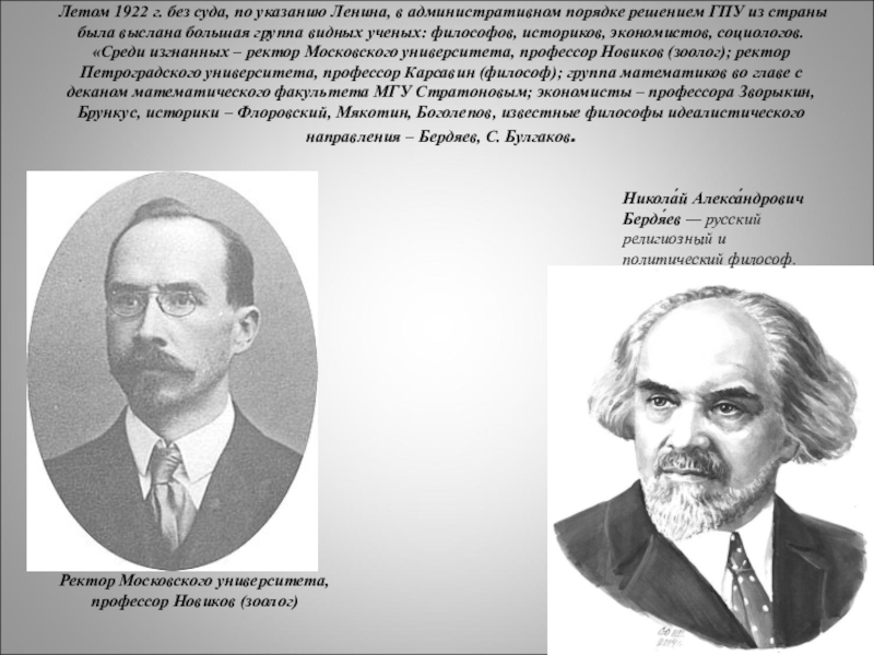 решением ГПУ из страны была выслана большая группа видных ученых: философов, историков, экономистов, социологов. «Среди изгнанных – ректор Московского университета, профессор Новиков (зоолог); ректор Петроградского университета, профессор Карсавин (философ); группа математиков во главе с деканом математического факультета МГУ Стратоновым; экономисты – профессора Зворыкин, Брункус, историки – Флоровский, Мякотин, Боголепов, известные философы идеалистического направления – Бердяев, С. Булгаков.