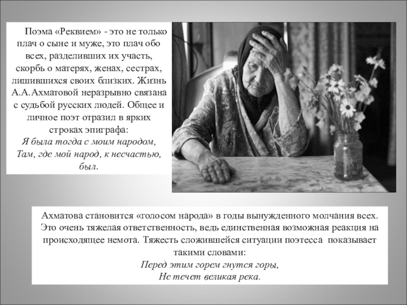 сыне и муже, это плач обо всех, разделивших их участь, скорбь о матерях, женах, сестрах, лишившихся своих близких. Жизнь А.А.Ахматовой неразрывно связана с судьбой русских людей. Общее и личное поэт отразил в ярких строках эпиграфа: