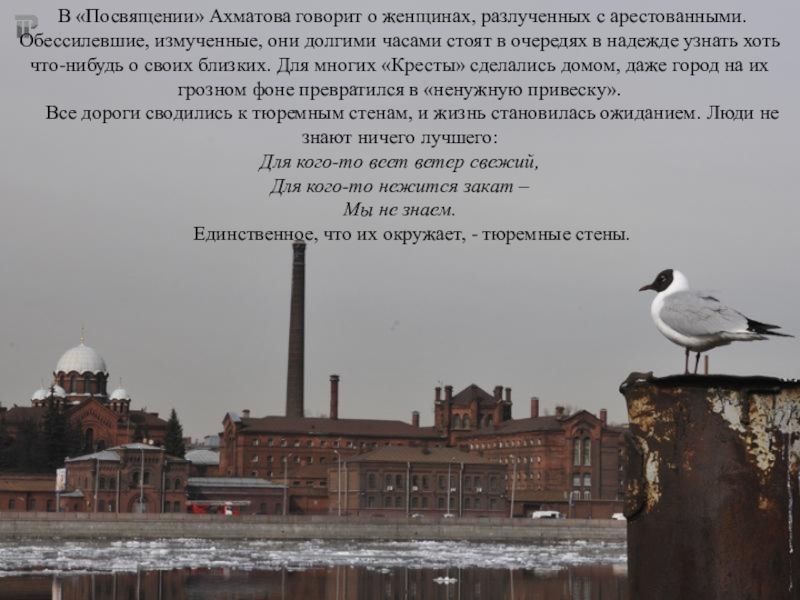 Слайд 18 В «Посвящении» Ахматова говорит о женщинах, разлученных с арестованными. Обессилевшие,