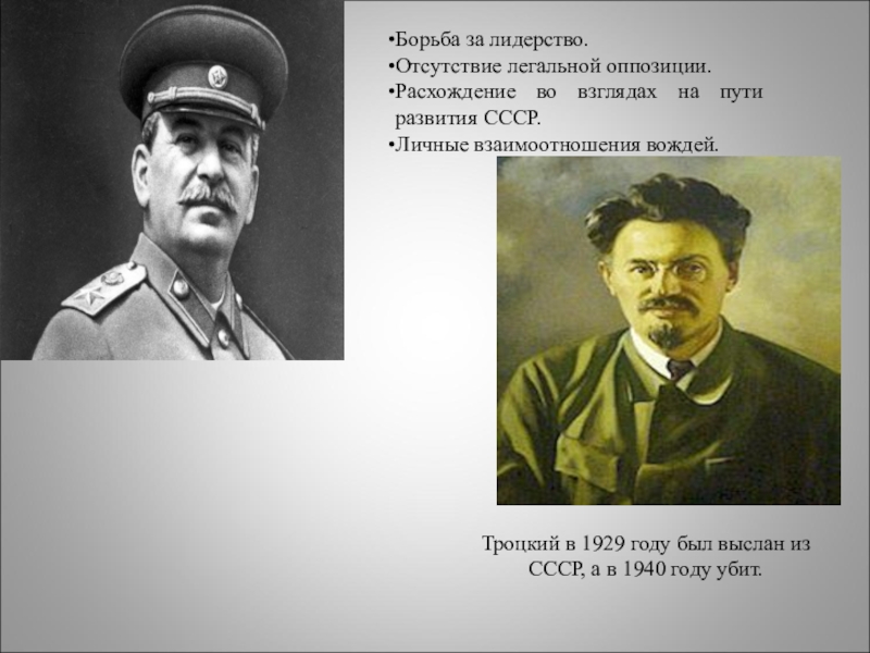 Троцкий в 1929 году был выслан из СССР, а в 1940 году убит.