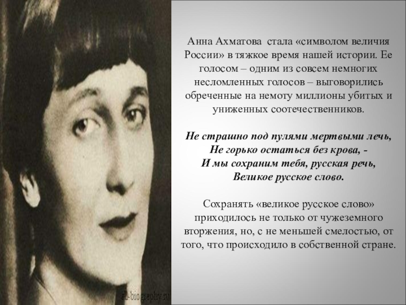 Слайд 21Анна Ахматова стала «символом величия России» в тяжкое время нашей истории.