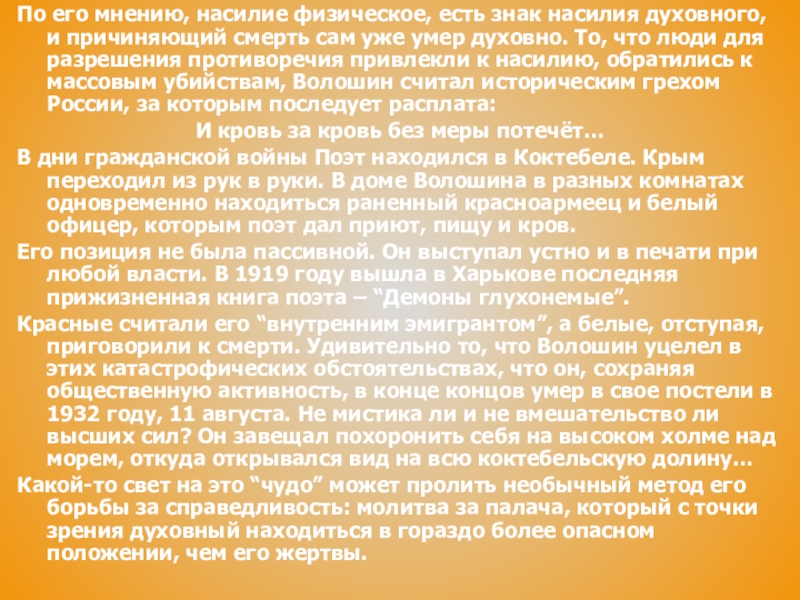 смерть сам уже умер духовно. То, что люди для разрешения противоречия привлекли к насилию, обратились к массовым убийствам, Волошин считал историческим грехом России, за которым последует расплата:
