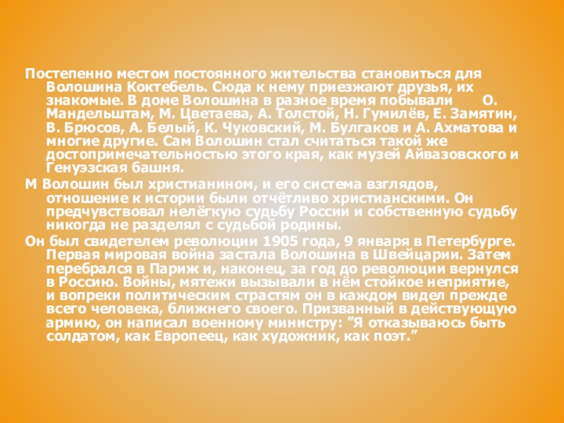 Слайд 8Постепенно местом постоянного жительства становиться для Волошина Коктебель. Сюда к нему