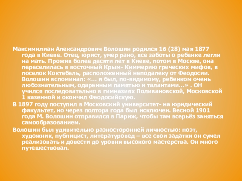 Слайд 7Максимилиан Александрович Волошин родился 16 (28) мая 1877 года в Киеве.