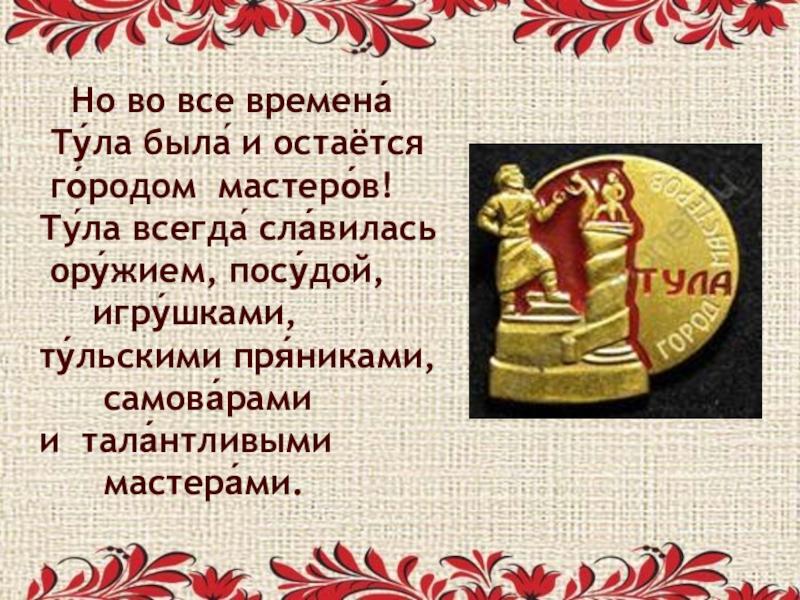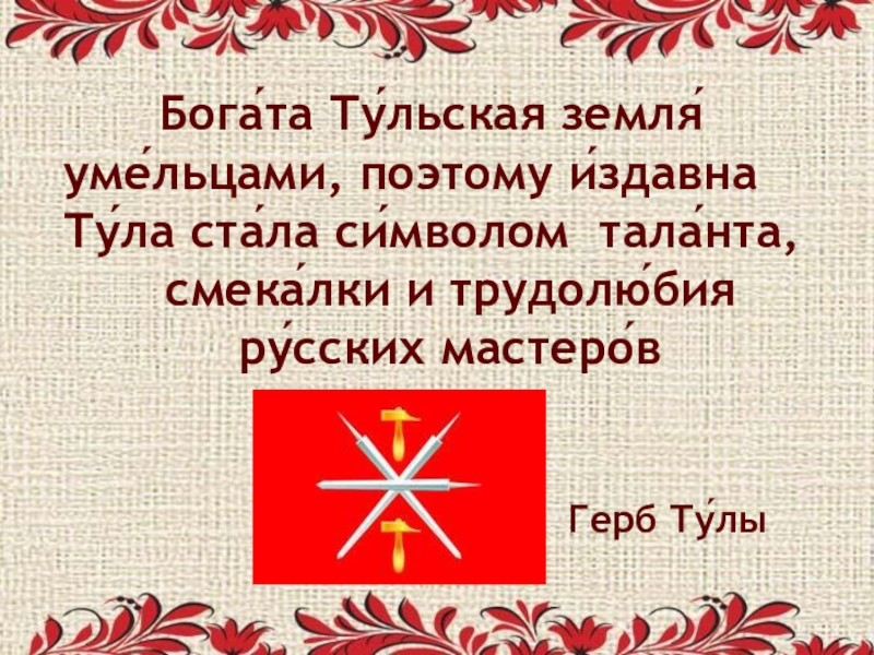 Слайд 32 Бога́та Ту́льская земля́ уме́льцами, поэтому и́здавна