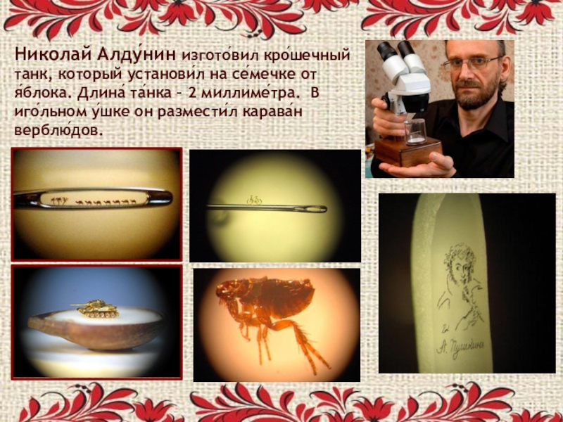 Слайд 43Николай Алду́нин изгото́вил кро́шечный танк, который установи́л на се́мечке от я́блока.
