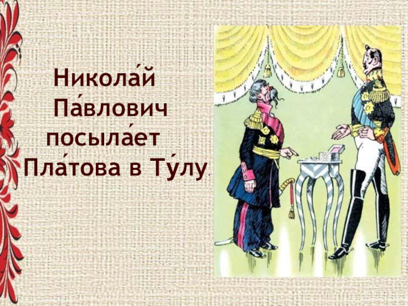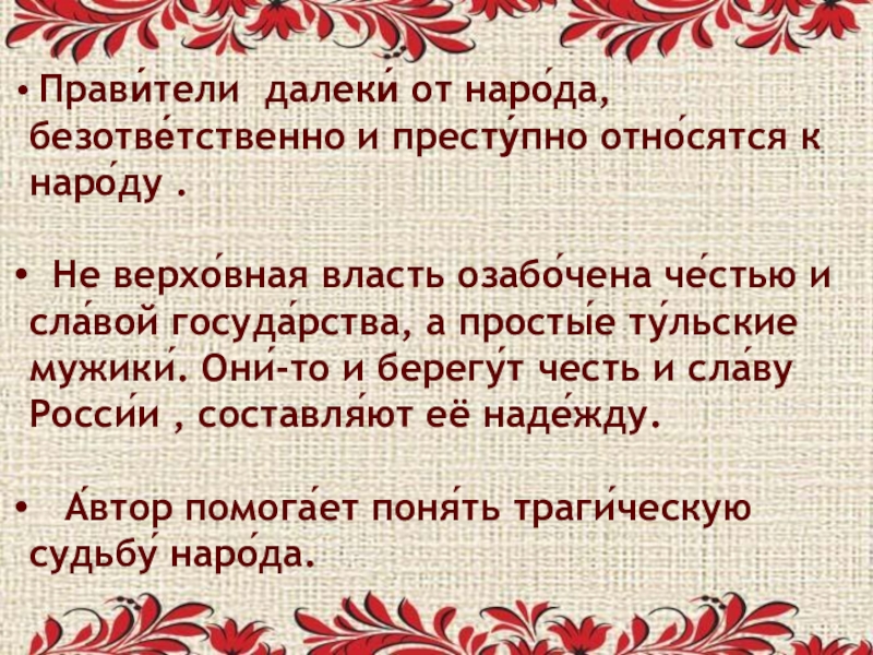 Не верхо́вная власть озабо́чена че́стью и сла́вой госуда́рства, а просты́е ту́льские мужики́. Они́-то и берегу́т честь и сла́ву Росси́и , составля́ют её наде́жду.