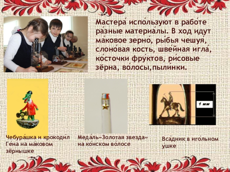 Слайд 42Мастера́ испо́льзуют в рабо́те ра́зные материа́лы. В ход идут ма́ковое зерно́,