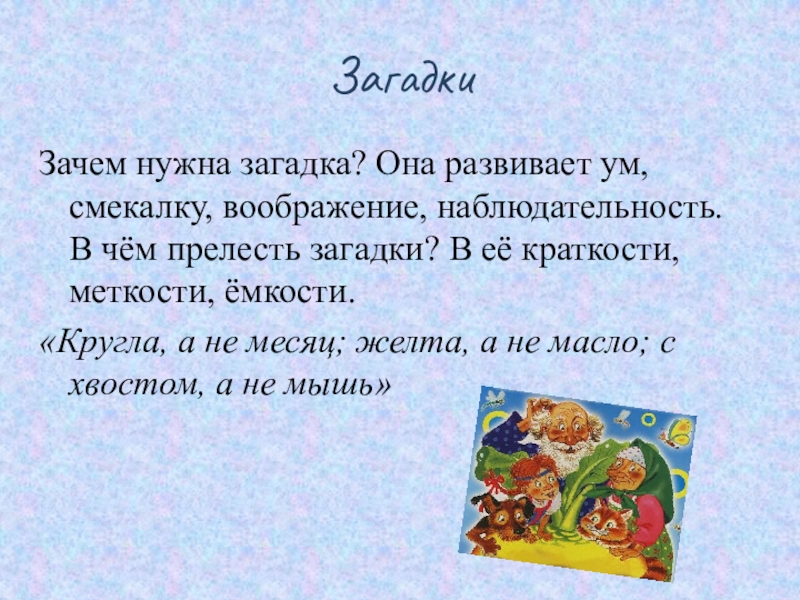 Зачем нужна загадка? Она развивает ум, смекалку, воображение, наблюдательность. В