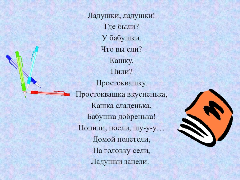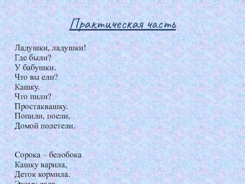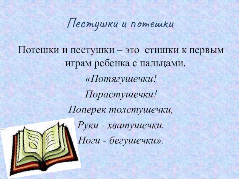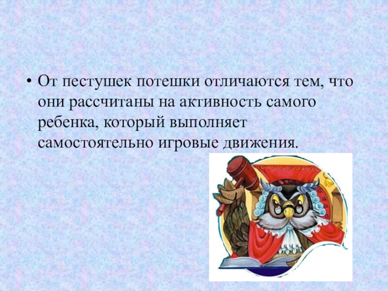 Слайд 6От пестушек потешки отличаются тем, что они рассчитаны на активность самого