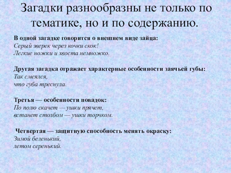 Слайд 11 Загадки разнообразны не только по тематике, но и по содержанию.