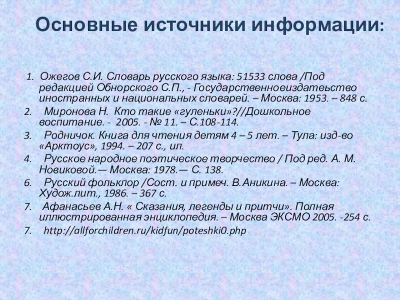 2. Миронова Н. Кто такие «гуленьки»?//Дошкольное воспитание. - 2005. - № 11. – С.108-114.