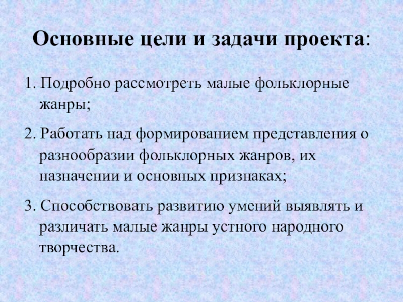 3. Способствовать развитию умений выявлять и различать малые жанры устного народного творчества.