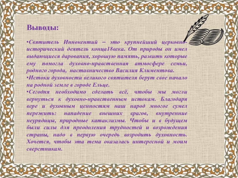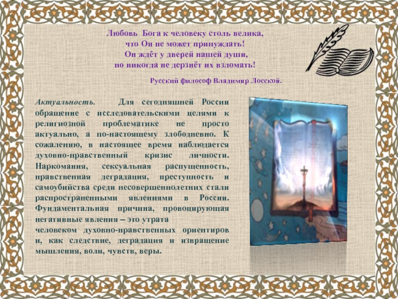 Актуальность. Для сегодняшней России обращение с исследовательскими целями к религиозной проблематике не просто актуально, а по-настоящему злободневно. К сожалению, в настоящее время наблюдается духовно-нравственный кризис личности. Наркомания, сексуальная распущенность, нравственная деградация, преступность и самоубийства среди несовершеннолетних стали распространенными явлениями в России. Фундаментальная причина, провоцирующая негативные явления – это утрата