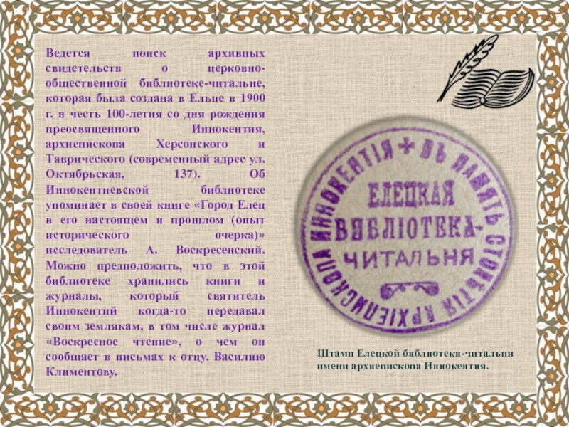 Штамп Елецкой библиотеки-читальни имени архиепископа Иннокентия.