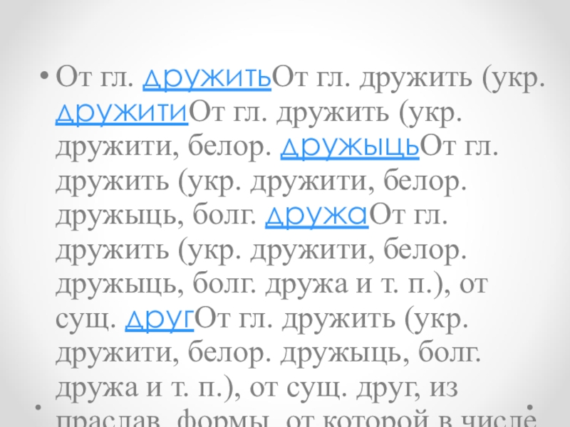 (укр. дружити, белор. дружыцьОт гл. дружить (укр. дружити, белор. дружыць, болг. дружаОт гл. дружить (укр. дружити, белор. дружыць, болг. дружа и т. п.), от сущ. другОт гл. дружить (укр. дружити, белор. дружыць, болг. дружа и т. п.), от сущ. друг, из праслав. формы, от которой в числе прочего произошли: ст.-слав. дрѹгъОт гл. дружить (укр. дружити, белор. дружыць, болг. дружа и т. п.), от сущ. друг, из праслав. формы, от которой в числе прочего произошли: ст.-слав. дрѹгъ (греч. φίλοςОт гл. дружить (укр. дружити, белор. дружыць, болг. дружа и т. п.), от сущ. друг, из праслав. формы, от которой в числе прочего произошли: ст.-слав. дрѹгъ (греч. φίλος), русск., укр. друг, болг. друг, сербохорв. дру̑г, словенск. drȗg, чешск., словацк. druhОт гл. дружить (укр. дружити, белор. дружыць, болг. дружа и т. п.), от сущ. друг, из праслав. формы, от которой в числе прочего произошли: ст.-слав. дрѹгъ (греч. φίλος), русск., укр. друг, болг. друг, сербохорв. дру̑г, словенск. drȗg, чешск., словацк. druh, др.-польск. drug.