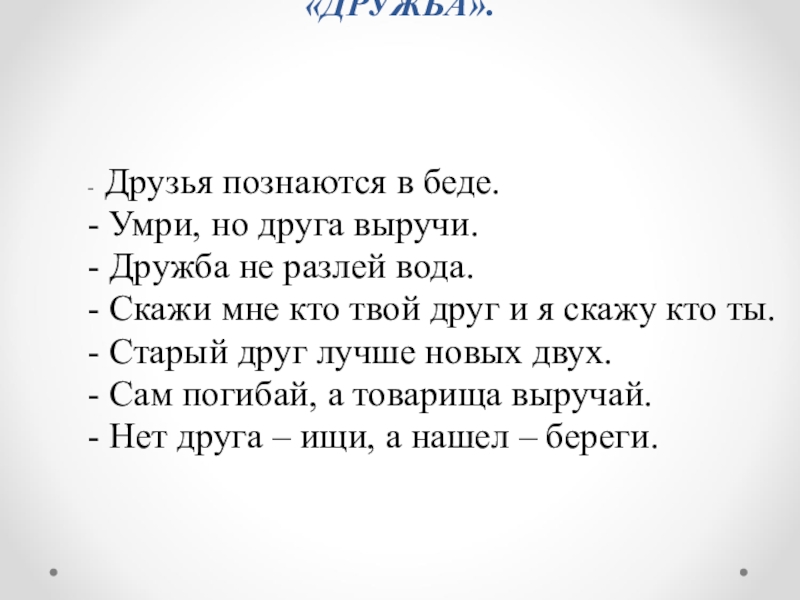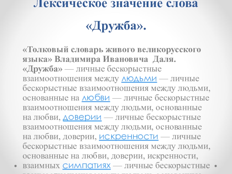 «Дружба» — личные бескорыстные взаимоотношения между людьми — личные бескорыстные взаимоотношения между людьми, основанные на любви — личные бескорыстные взаимоотношения между людьми, основанные на любви, доверии — личные бескорыстные взаимоотношения между людьми, основанные на любви, доверии, искренности — личные бескорыстные взаимоотношения между людьми, основанные на любви, доверии, искренности, взаимных симпатиях — личные бескорыстные взаимоотношения между людьми, основанные на любви, доверии, искренности, взаимных симпатиях, общих интересах — личные бескорыстные взаимоотношения между людьми, основанные на любви, доверии, искренности, взаимных симпатиях, общих интересах и увлечениях. Обязательными признаками дружбы являются взаимность, доверие и терпение. Людей, связанных между собой дружбой, называют друзьями.