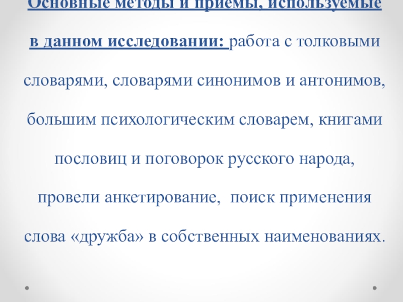 словарями, словарями синонимов и антонимов, большим психологическим словарем, книгами пословиц и поговорок русского народа, провели анкетирование, поиск применения слова «дружба» в собственных наименованиях.