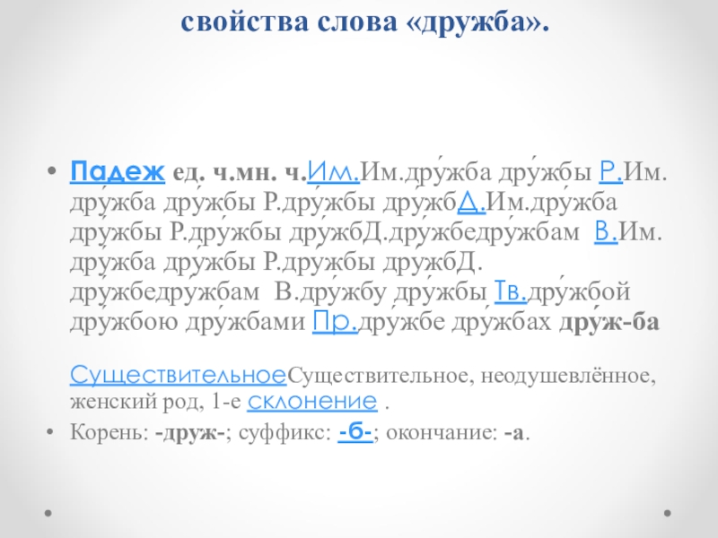 Падеж ед. ч.мн. ч.Им.Им.дру́жба дру́жбы Р.Им.дру́жба дру́жбы Р.дру́жбы