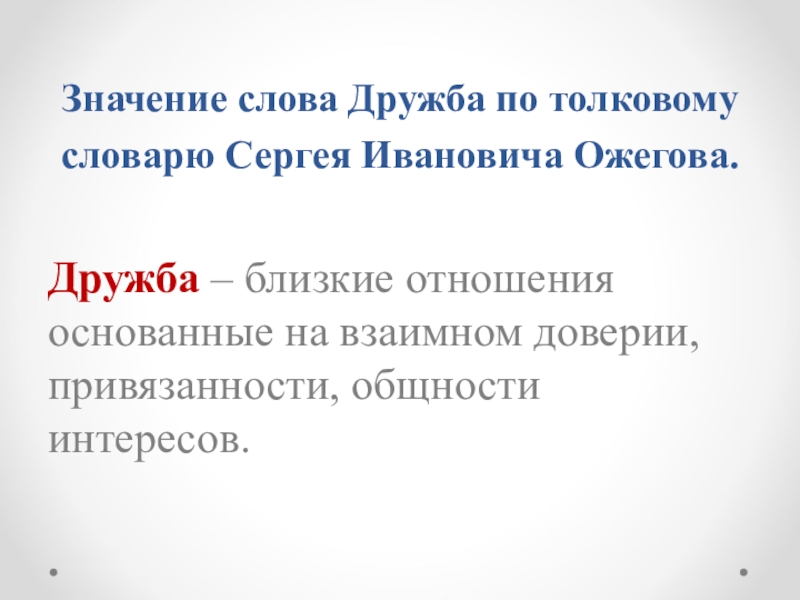 Слайд 13Значение слова Дружба по толковому словарю Сергея Ивановича Ожегова.