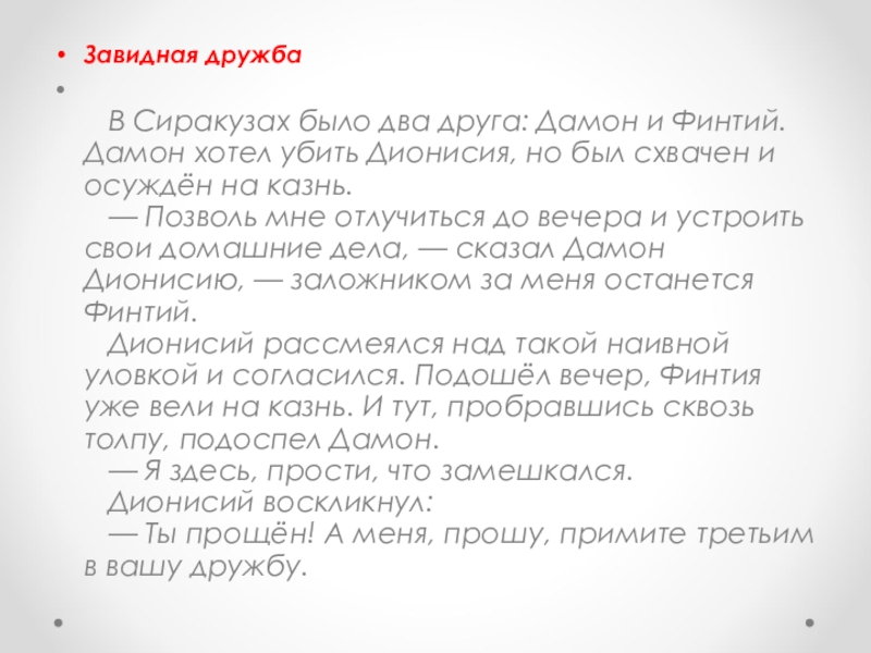 В Сиракузах было два друга: Дамон и Финтий. Дамон хотел