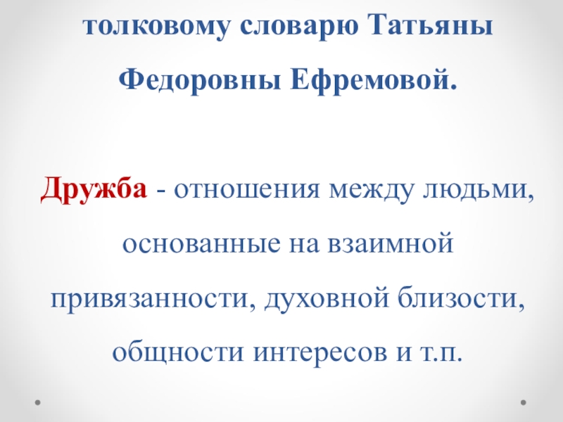 Слайд 11Значение слова Дружба по толковому словарю Татьяны Федоровны Ефремовой.