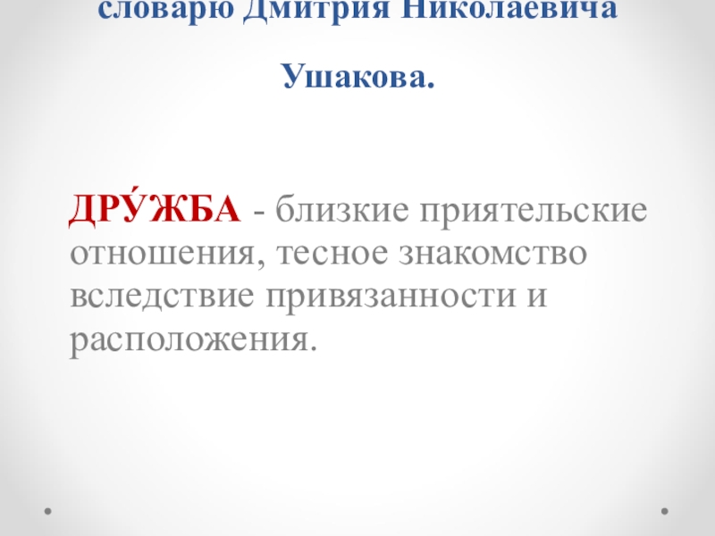 Слайд 12Значение слова Дружба по толковому словарю Дмитрия Николаевича Ушакова.