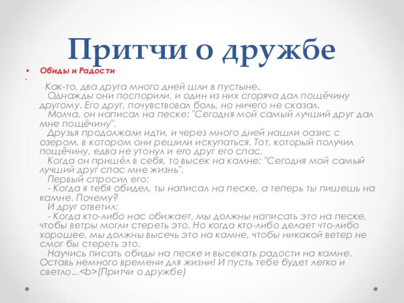 Научись писать обиды на песке и высекать радости на камне. Оставь немного времени для жизни! И пусть тебе будет легко и светло...(Притчи о дружбе)