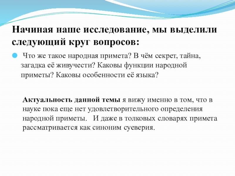 Актуальность данной темы я вижу именно в том, что в науке пока еще нет удовлетворительного определения народной приметы. И даже в толковых словарях примета рассматривается как синоним суеверия.