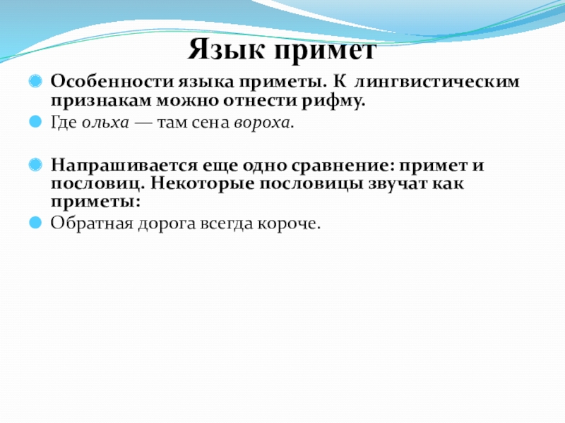 Особенности языка приметы. К лингвистическим признакам можно отнести рифму.