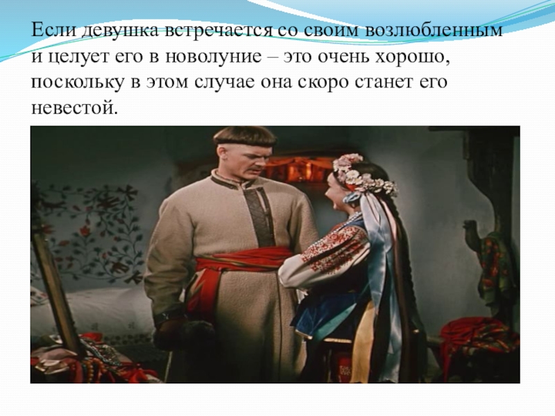 Слайд 18Если девушка встречается со своим возлюбленным и целует его в новолуние