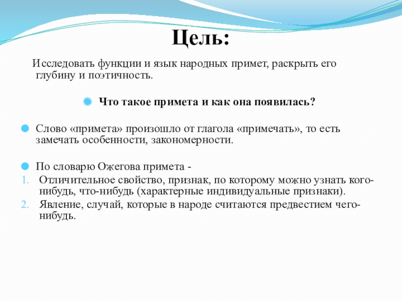 Исследовать функции и язык народных примет, раскрыть его глубину