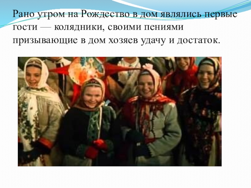 Слайд 21Рано утром на Рождество в дом являлись первые гости — колядники,