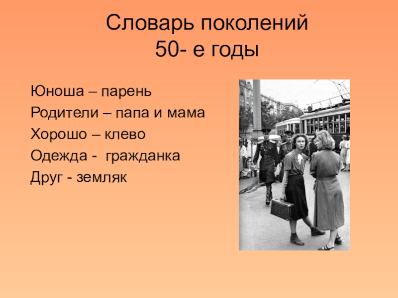 Словарь поколений 50- е годы Юноша – пареньРодители – папа и мамаХорошо – клевоОдежда - гражданкаДруг -