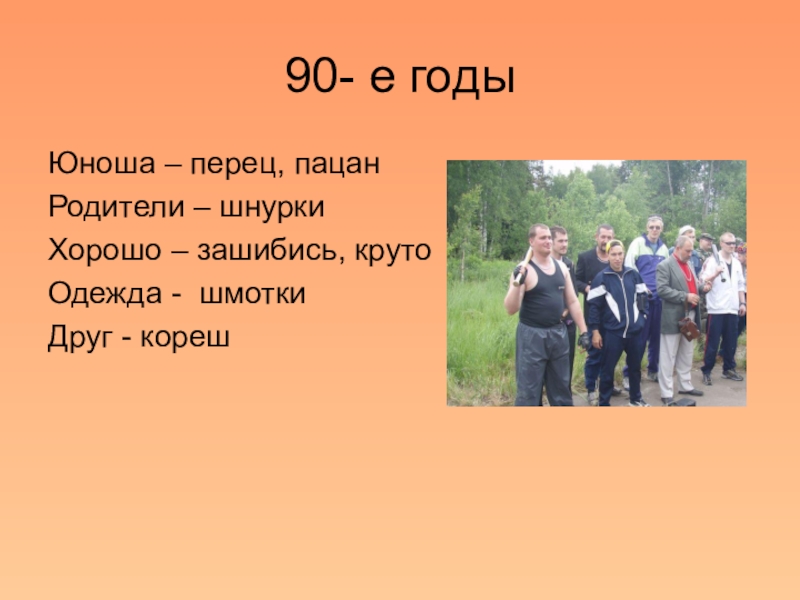 90- е годыЮноша – перец, пацанРодители – шнуркиХорошо – зашибись, крутоОдежда - шмоткиДруг - кореш