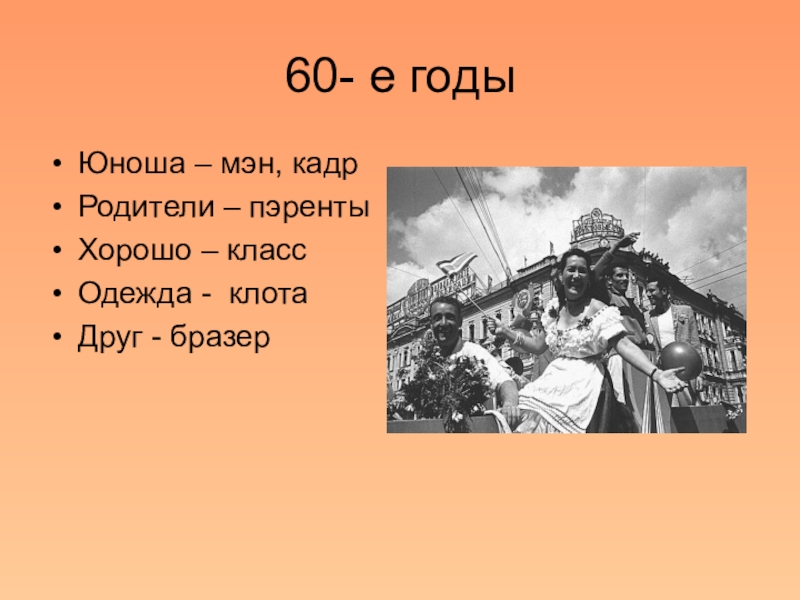60- е годыЮноша – мэн, кадрРодители – пэрентыХорошо – классОдежда - клотаДруг - бразер