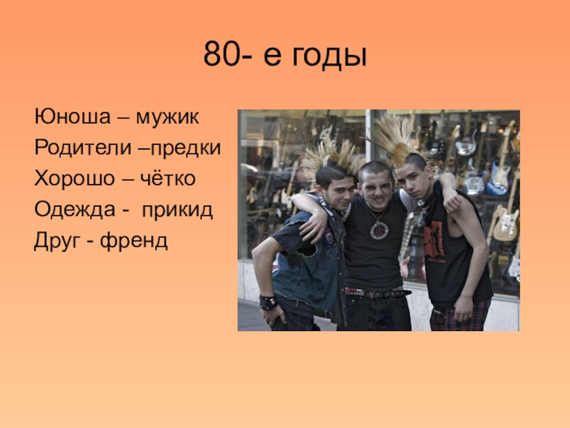 80- е годыЮноша – мужикРодители –предкиХорошо – чёткоОдежда - прикидДруг - френд