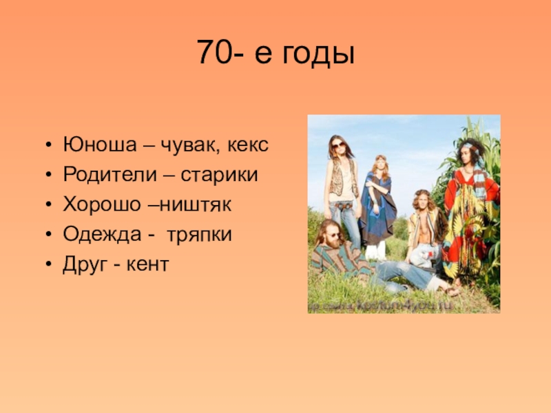 70- е годыЮноша – чувак, кексРодители – старикиХорошо –ништякОдежда - тряпкиДруг - кент