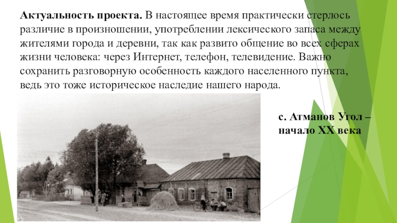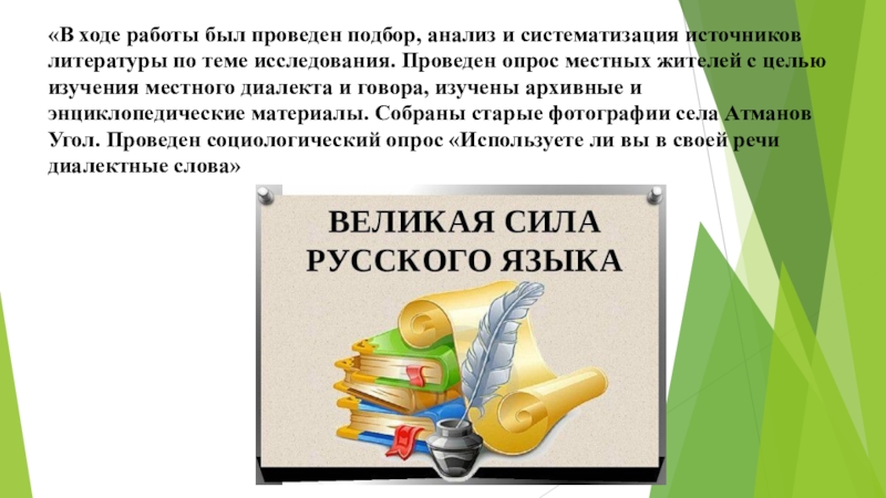по теме исследования. Проведен опрос местных жителей с целью изучения местного диалекта и говора, изучены архивные и энциклопедические материалы. Собраны старые фотографии села Атманов Угол. Проведен социологический опрос «Используете ли вы в своей речи диалектные слова»