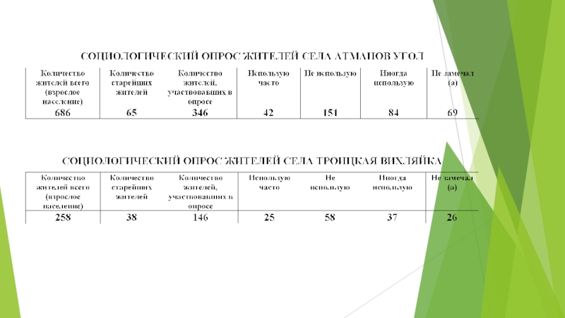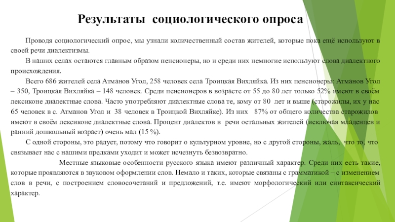Всего 686 жителей села Атманов Угол, 258 человек села Троицкая Вихляйка. Из них пенсионеры: Атманов Угол – 350, Троицкая Вихляйка – 148 человек. Среди пенсионеров в возрасте от 55 до 80 лет только 52% имеют в своём лексиконе диалектные слова. Часто употребляют диалектные слова те, кому от 80 лет и выше (старожилы, их у нас 65 человек в с. Атманов Угол и 38 человек в Троицкой Вихляйке). Из них 87% от общего количества старожилов имеют в своём лексиконе диалектные слова. Процент диалектов в речи остальных жителей (исключая младенцев и ранний дошкольный возраст) очень мал (15 %).