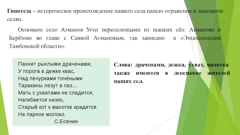 Слайд 6Гипотеза – историческое происхождение нашего села нашло отражение в лексиконе селян.
